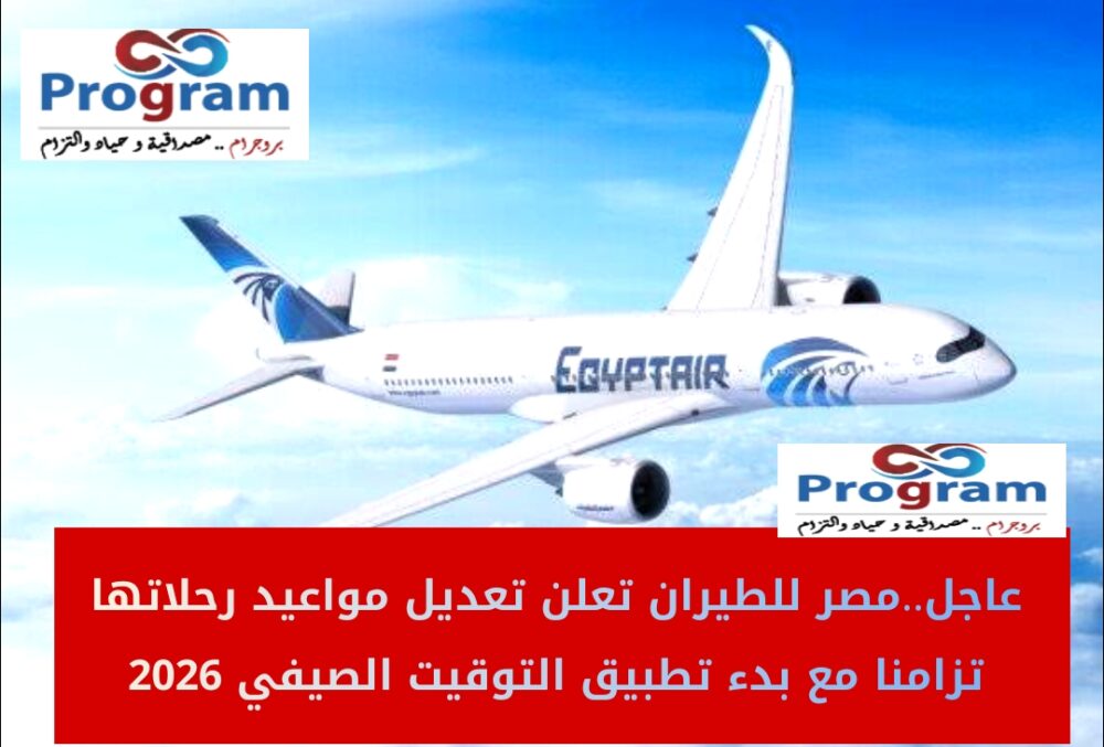 موقع بروجرام أعلنت مصر للطيران بدء انطلاق رحلاتها تبعا للتوقيت الصيفي وقالت الشركة في بيان لها «نظرا لبدء تطبيق التوقيت الصيفي في جمهورية مصر العربية اعتبارا من الدقيقة الأولى من فجر يوم الجمعة الموافق 24 أبريل 2026، سوف تقلع جميع رحلات الناقل الوطني _ مصر للطيران طبقا للتوقيت الصيفي».